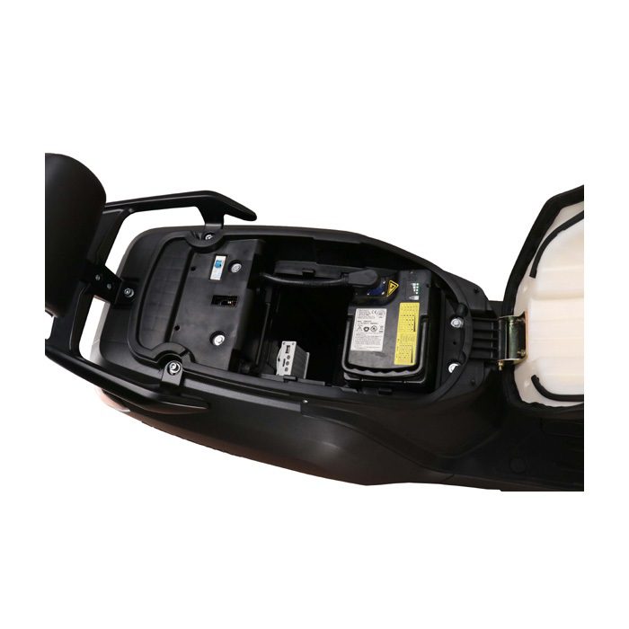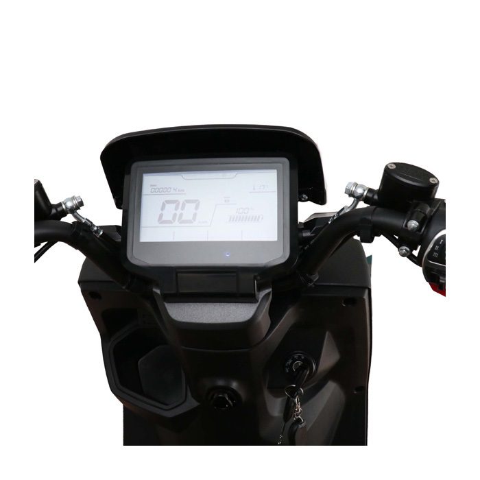 Natuurlijk heeft de scooter voor en achter schijfremmen, met 12 inch velgen. Een prachtig digitaal dashboard, voorzien van een achteruit en USB-aansluiting.